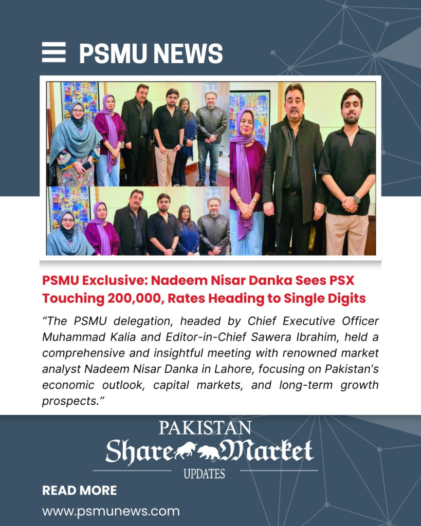 Lahore: The PSMU team, led by CEO Muhammad Kalia and Editor-in-Chief Sawera Ibrahim, met renowned market analyst Nadeem Nisar Danka in Lahore, where wide-ranging and insightful discussions were held on Pakistan’s economic outlook, capital markets, and future growth trajectory.