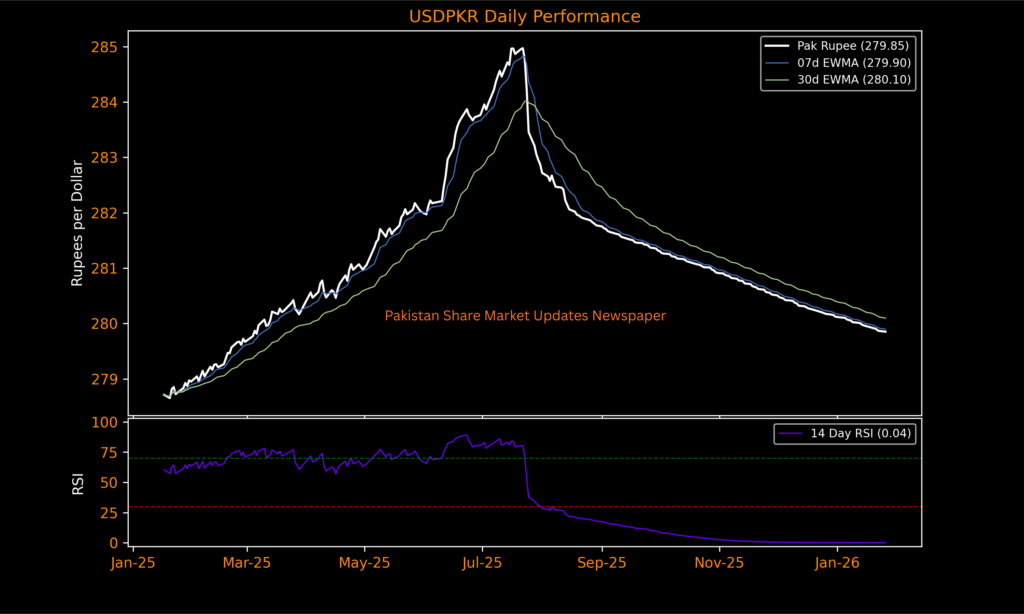 During the current fiscal year, PKR has rose against the US Dollar by 3.91 rupees or 1.40%. While it has increased 27.12 paisa or 0.10% so far this calendar year.In the Money Market, the benchmark 6 Month Karachi Interbank Bid and Offer rates inched down by 3bps to 9.93% and 10.18%.